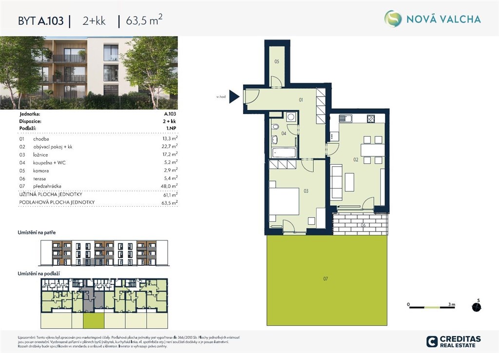 Nabízíme k prodeji byt 2+kk o celkové výměře 64 m2 s terasou 5,40 m2 a předzahrádkou 48 m2. Ideální volba pro jednotlivce, páry i jako výhodná investice do nemovitosti. Byt nabízí komfortní a efektivní bydlení v klidné části Plzně s výbornou dostupností do centra. Lokalita Nové Valchy se nachází v jihozápadní části Plzně, čtvrtém největším městě České republiky. Ze severu je vymezena lesy, které spojují Valchu a Borská pole, z jihu ji obklopuje stávající vilová zástavba. Tento projekt tak nabízí nejen klidné bydlení, ale i snadnou dostupnost do centra města - pár minut pěší chůzí je zastávka MHD s přímým spojením. V docházkové vzdálenosti projektu se nachází menší prodejna potravin a za většími nákupy vyrazíte do nákupního centra Borská pole. V sousední Lhotě a Liticích pak najdete veškerou další občanskou vybavenost včetně mateřské a základní školy, knihovny nebo pošty. Přilehlé lesy vybízejí k výpravám do přírody i celoročnímu aktivnímu vyžití. Milovníci sportu mohou využít blízkou tělocvičnu TJ Sokol Valcha, kde po sportovních výkonech nechybí možnost občerstvení v hospůdce Na Zelené Louce. V okolí je dostupná veškerá občanská vybavenost, včetně škol, knihovny, pošty a nákupního centra Borská pole. Plánované dokončení projektu: Q3 2027. Uvedené ceny nezahrnují garážové stání a sklep. Cena garážového stání: 250 000 Kč včetně DPH Cena sklepů: od 35 000 Kč včetně DPH (dle velikosti) V případě zájmu nás neváhejte kontaktovat. Prodej přímo od majitele. Více informací o tomto bytu A.103 a kompletní nabídce najdete na našich webových stránkách creditasre.