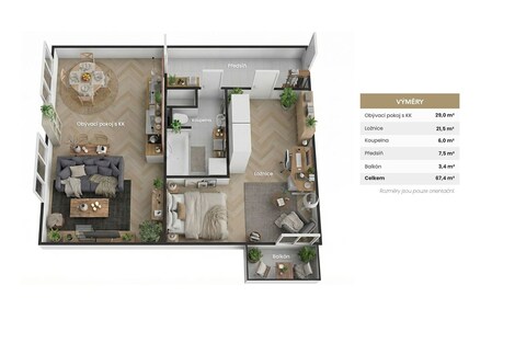 Hledáte moderní domov, který kombinuje styl, maximální úspornost a skvělou lokalitu v širším centru Plzně? Tento světlý a vzdušný byt o celkové ploše 67,4 m2 v ulici Poděbradova je přesně tím místem, kde se nebudete muset omezovat. Nachází se v moderním bytovém domě z roku 2019 a díky energetické třídě A (mimořádně úsporná) nabízí nejen minimální provozní náklady, ale také možnost získat výhodnější podmínky financování u bank. Byt působí klidně a čistě hned při vstupu. Dispozice je promyšlená tak, aby vyhovovala jak pro vlastní bydlení, tak jako bezpečná investice s vysokým potenciálem pronájmu. Obývací pokoj s kuchyní (28 m2): Velkorysý prostor pro každodenní život i setkání s přáteli. Kuchyně je vybavena moderní linkou s vestavnými spotřebiči a bonusem v podobě kvalitního vodního filtru eSpring pro špičkovou pitnou vodu. Ložnice (20,5 m2): Nadstandardně prostorná místnost, která nabízí klid pro váš odpočinek. Samostatná šatna: Velká výhoda tohoto bytu! Kompletní modulární systém IKEA řeší úložné prostory elegantně a bez nutnosti zaplňovat pokoje skříněmi, případně prostor pro postel. Balkon (3,4 m2): Ideální místo pro ranní kávu nebo večerní relax po práci. Kvalita a technologie V celém bytě najdete praktickou kombinaci plovoucích podlah a dlažby pro snadnou údržbu. Samozřejmostí je vysokorychlostní optický internet. Celý dům i společné prostory jsou navíc zabezpečeny kamerovým systémem, což vám dodá maximální pocit bezpečí. Lokalita a parkování Bydlení v ulici Poděbradova znamená mít město na dlani. V docházkové vzdálenosti najdete: Centrum města a OC Plaza (nákupy, kino, restaurace) Centrální autobusové nádraží a MHD Kompletní občanskou vybavenost a kulturu Parkování je možné v modrých zónách přímo u domu nebo u nedalekého nádraží. Velkým benefitem je sousední soukromé parkoviště, kde se pravidelně objevují možnosti pronájmu krytého stání. Dispozice a výměry: Obývací pokoj + KK: 28,0 m2 Ložnice: 20,5 m2 Koupelna: 5,9 m2 Předsíň: 7,5 m2 Balkon: 3,4 m2 Celková plocha: 67,4 m2 Nízké měsíční náklady a nízký fond oprav dělají z této nemovitosti jednu z nejatraktivnějších nabídek v dané lokalitě. Přijďte se o výjimečné atmosféře tohoto bytu přesvědčit osobně. Rád vás nemovitostí provedu a v případě zájmu vám pomůžeme zajistit nejvýhodnější financování na trhu. Zavolejte mi a domluvíme si termín prohlídky!